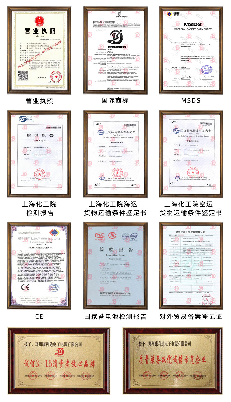 公司生产销售自有品牌KANGLIDA,同时也为顾客提供OEM服务,康利达产品严格按照ISO9000国际标准建立质量保障体系,产品通过欧盟CE认证和国家电池产品质量监督检验中心的检测。康利达蓄电池穿越四大洋、畅销五大洲!